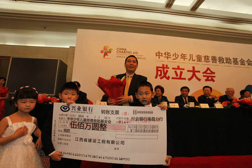 中華少年兒童慈善救助基金會(以下簡稱“兒慈會”)2010年1月12日在北京人民大會堂正式成立。中共中央政治局常委、國務(wù)院副總理李克強(qiáng)在為基金會成立發(fā)來的賀信中說:“慈善救助是一項(xiàng)崇高的事業(yè),是對社會保障的重要補(bǔ)充。謹(jǐn)對基金會的成立表示祝賀,對大家矢志從事少年兒童事業(yè)表示由衷的敬意。希望并相信你們會在各方支持下,發(fā)揮優(yōu)勢,搭建平臺,幫助更多有特殊困難的少年兒童和他們的同齡人,一起在同一片藍(lán)天下健康成長。”江西省建設(shè)工程有限公司董事長宗贛生到會并捐贈人民幣500萬元設(shè)立"自立奮進(jìn)獎",宗贛生表示,以后會根據(jù)企業(yè)發(fā)展?fàn)顩r捐款額逐年遞增,對貧困學(xué)生以及教師進(jìn)行資助和獎勵。